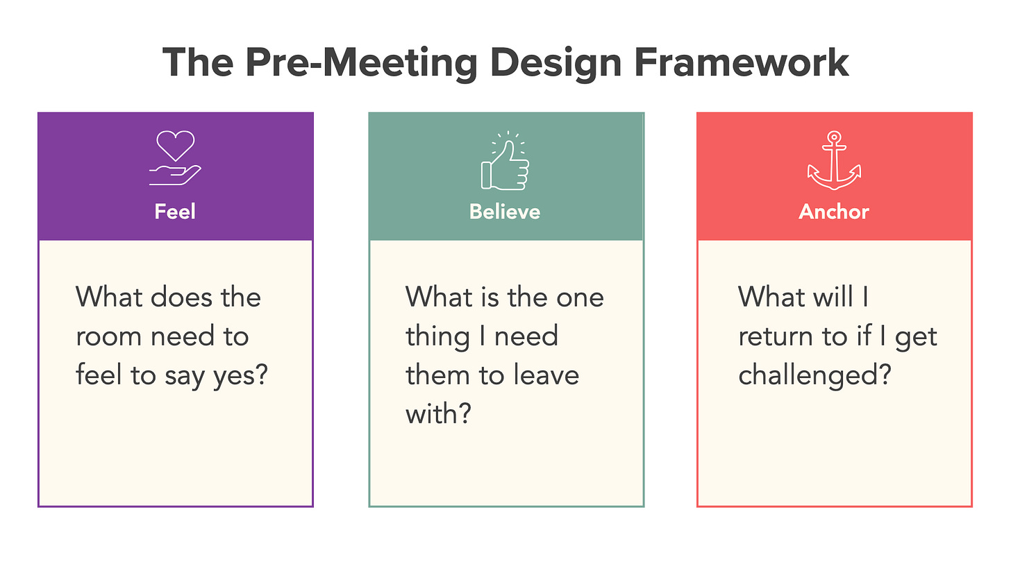 What the room needs to feel, not just know. Safe. Aligned. Confident in the direction. When our brains are busy tracking every reaction and managing every input in real time, it helps to have already answered this question before you’re in it. What emotional state does the room need to be in to say yes, and what’s your part in creating that?